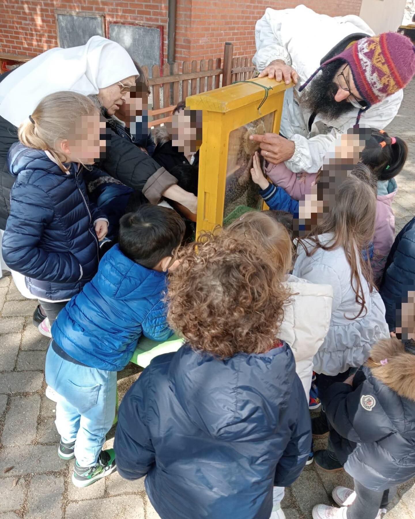 Con l’abbigliamento protettivo, tipico dell’apicoltore, ha incontrato nel giardino della scuola i bambini delle varie sezioni che con grande attenzione hanno osservato le varie attrezzature e le spiegazioni sulla produzione del miele, l’arnia e i vari telai che compongono la casetta delle api.