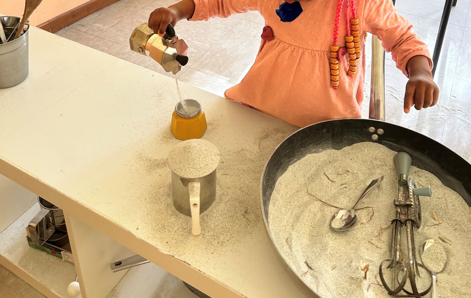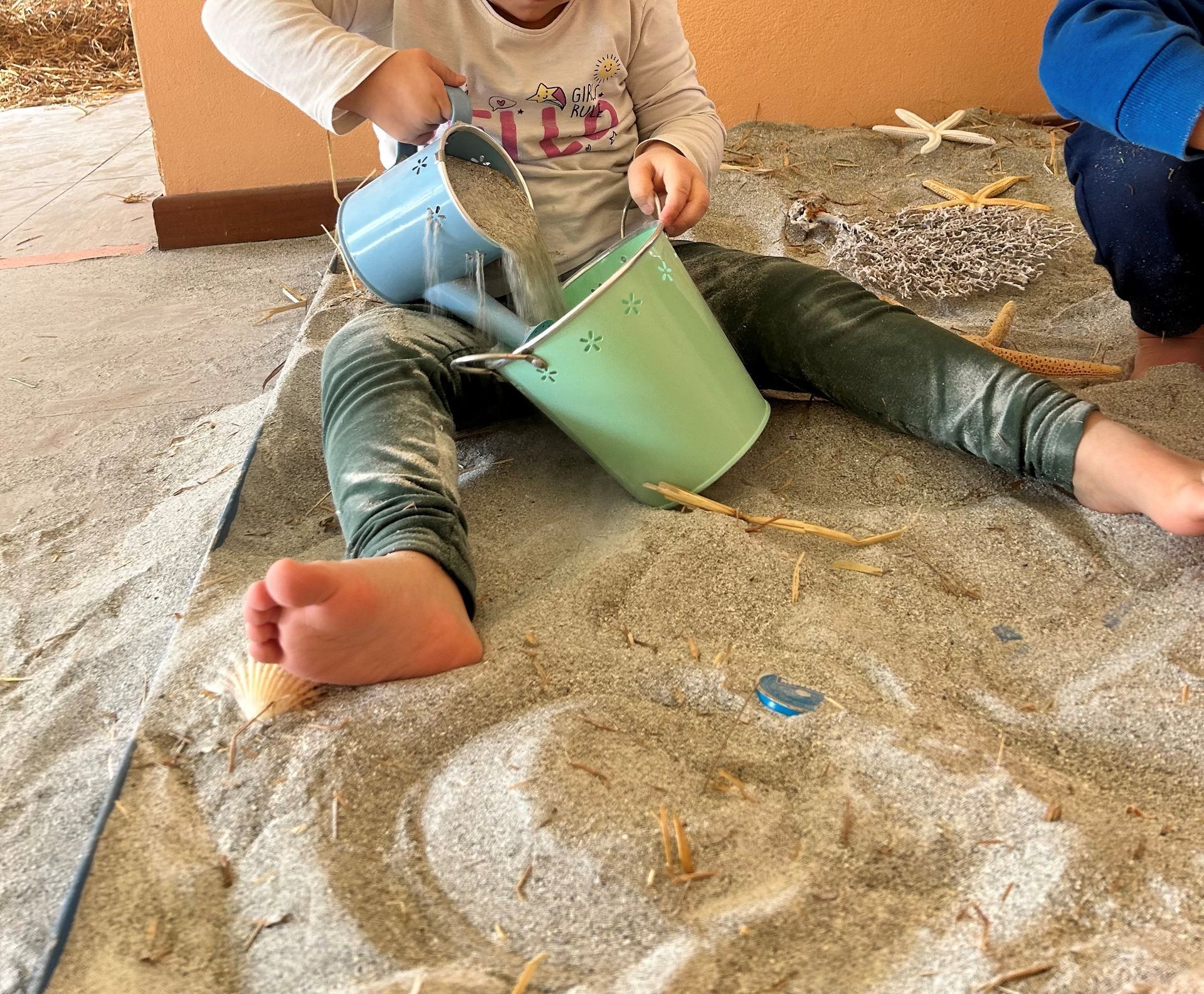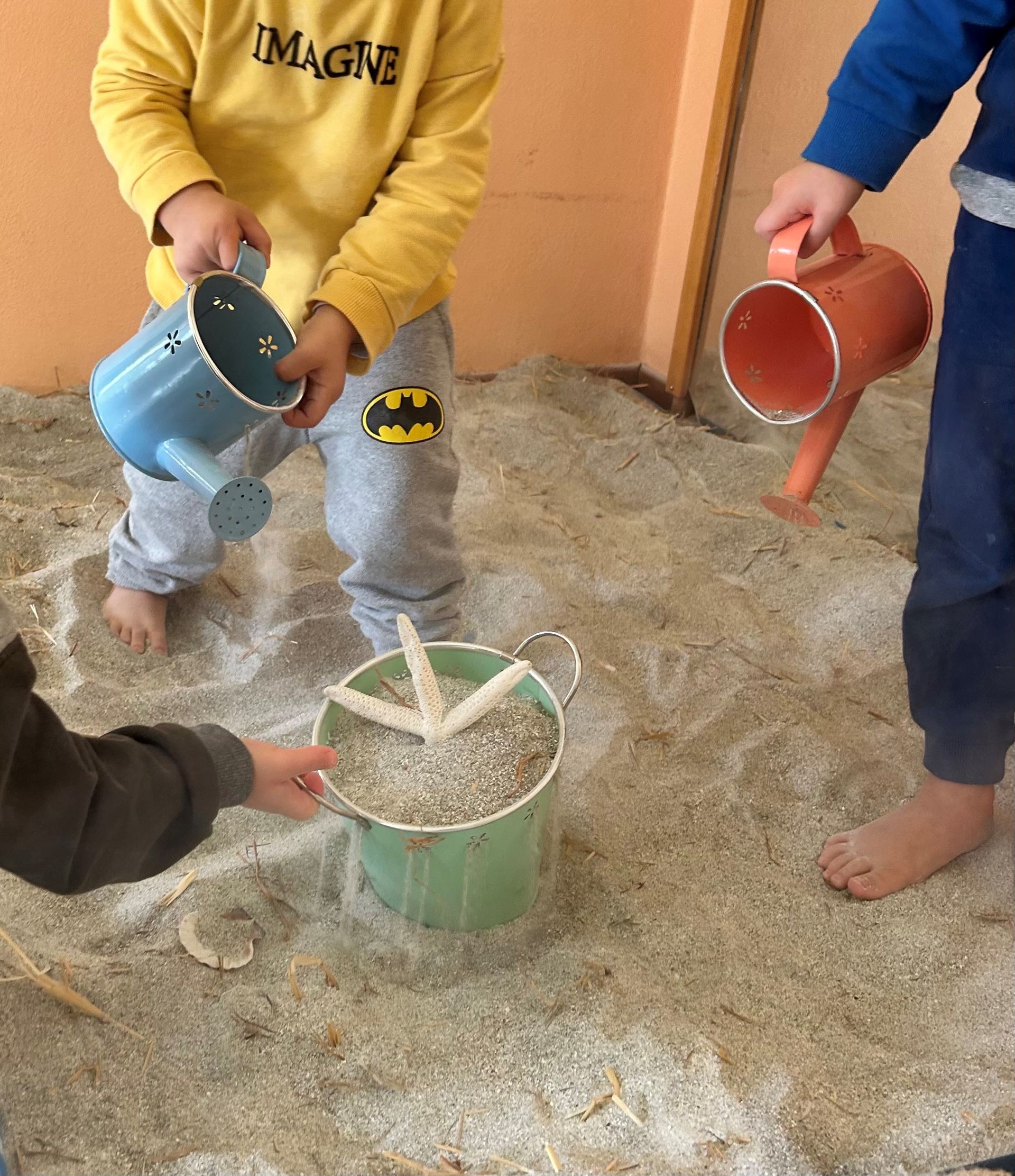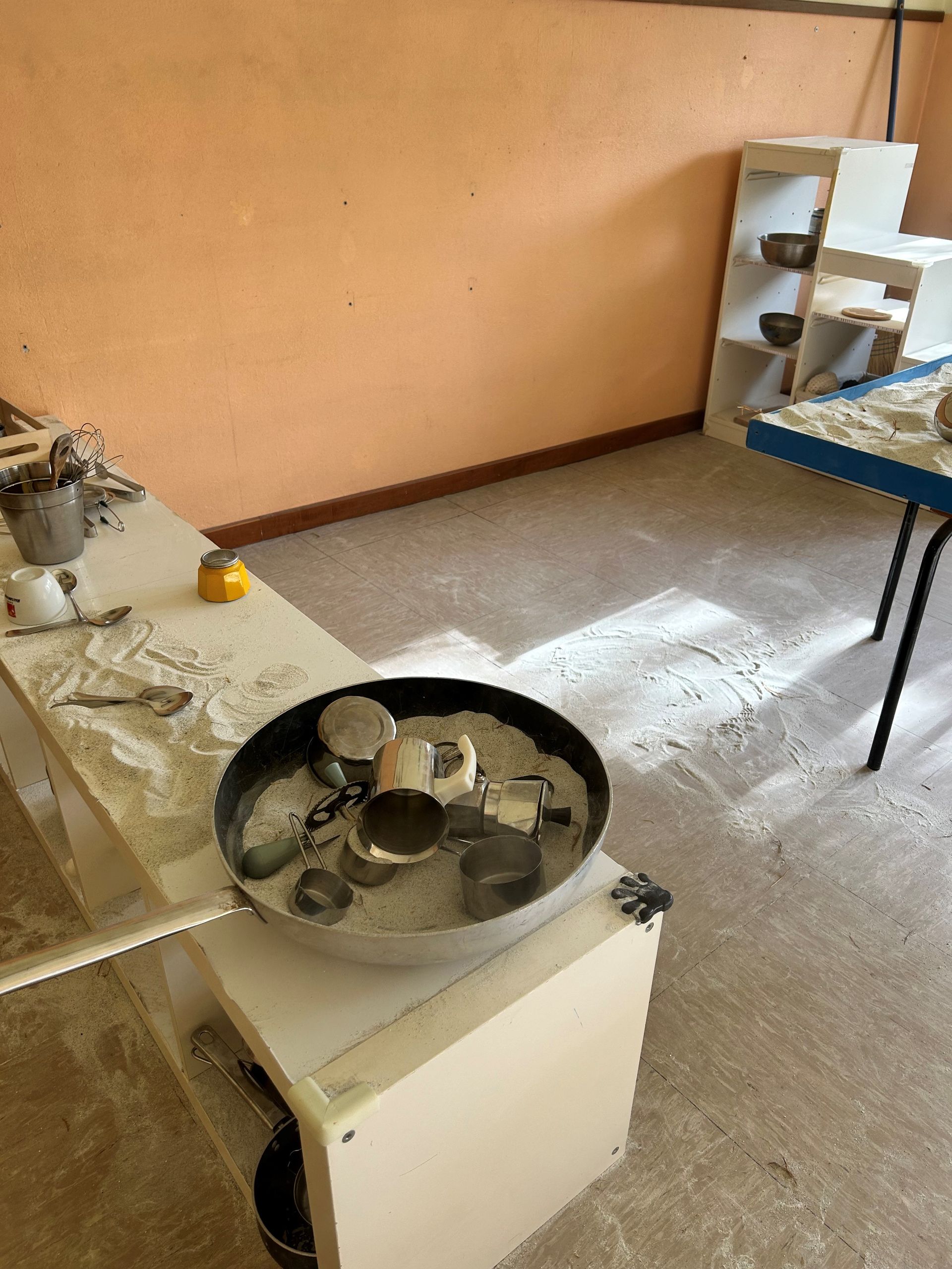 Si entra a piedi nudi e i bambini sono liberi di toccare, entrare nella sabbia, travasare, riempire e svuotare, toccare… scegliendo a che altezza lavorare: la sabbia è all’interno di tavoli, a terra per poterci entrare con i piedi, in contenitori più piccoli…