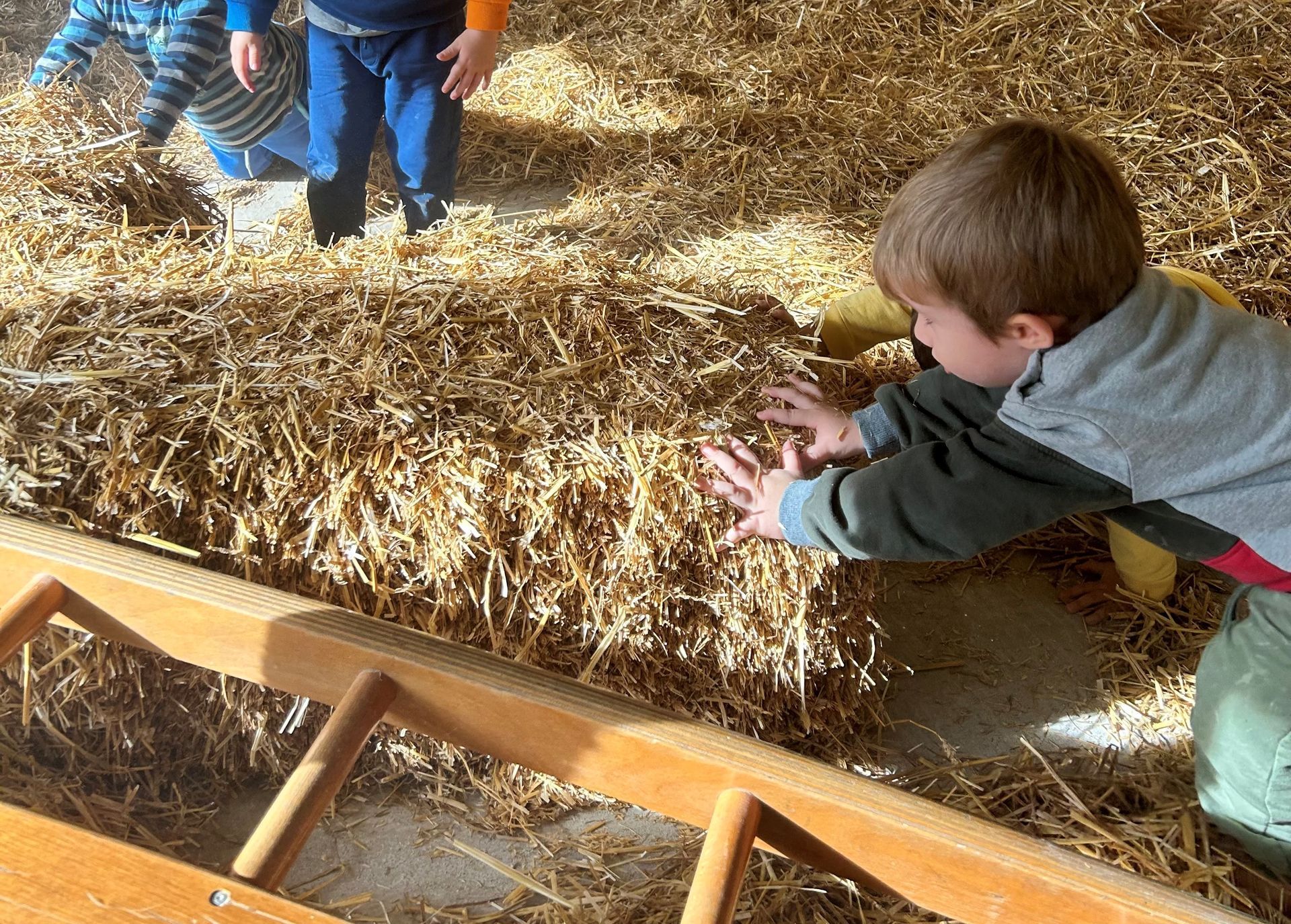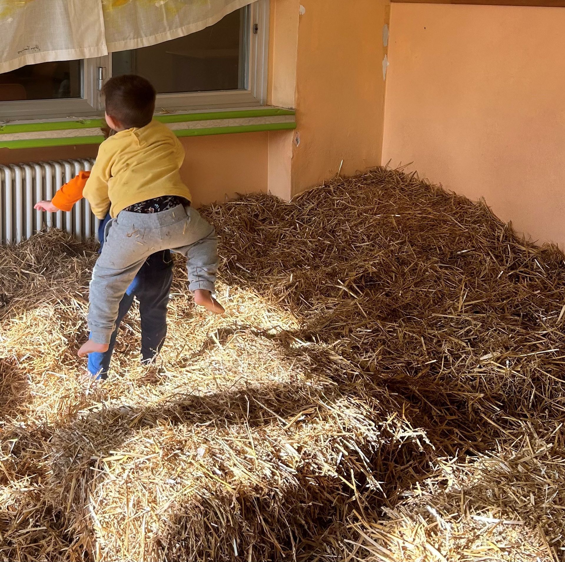 Vicino a questo gioco finemotorio, in cui i bambini fanno scoperte ed entrano in relazione con un materiale “che non ti aspetti all’interno”, i bambini ritrovano uno spazio grossomotorio, creato semplicemente con materiali di legno e paglia, tanta paglia. Qui i bambini possono sedersi a riposare, oppure usare le balle per arrampicarsi e saltare. C’è anche un triangolo Pikler, struttura triangolare in legno, che permette ai bambini di sviluppare le proprie capacità motorie in piena autonomia, aumentando nel frattempo fiducia e sicurezza in sé stessi.