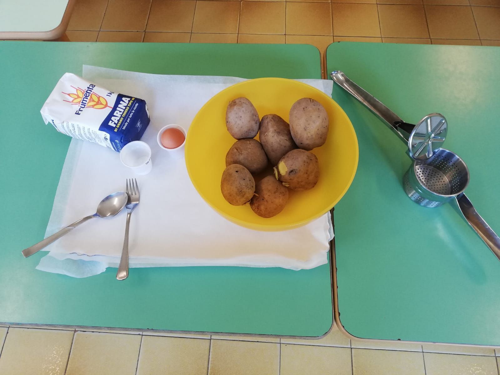 Insegnanti e bambini, per prima cosa hanno preparato gli utensili e gli ingredienti: una ciotola, uno schiacciapatate, un vassoio, dei coltelli, le patate, un uovo, un pizzico di sale e farina quanto basta.