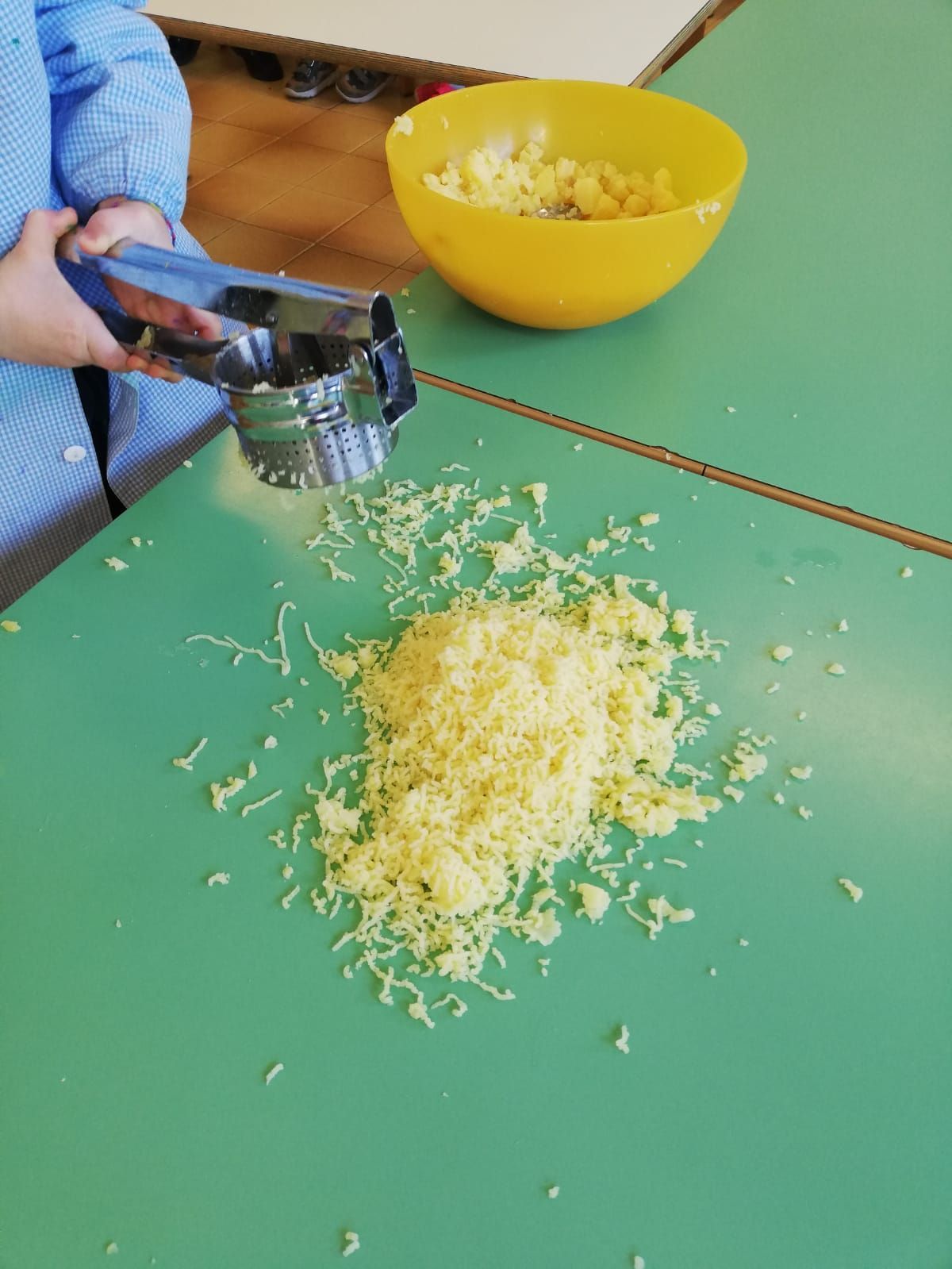 La cuoca ha lessato le patate. I bambini, intiepidite le patate, le hanno sbucciate, poi con il coltello le hanno tagliate a tocchetti e infine passate nello schiacciapatate. Quest’ultima operazione è particolarmente adorata dai bambini, perché vedono trasformarsi la polpa della patata in morbidi riccioli che ricadono nella ciotola.