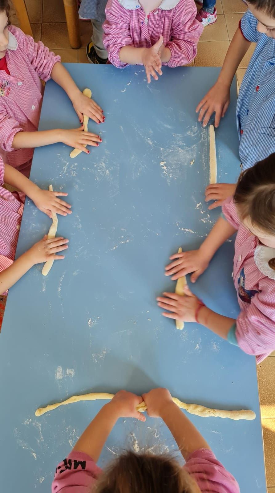 Nella fase dell’impasto, i bambini hanno aggiunto l’uovo, il sale e la farina un po' alla volta quanto basta per rendere l’impasto lavorabile. Si sono formati tanti rotolini spessi un dito, “i serpentelli” che infine sono stati tagliati a tocchetti e poi adagiati su un vassoio pronti da portare in cucina a cuocere.