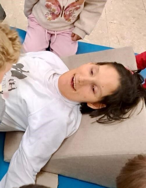 Invece di restare sulla propria carrozzella, Caterina e Francesca, ad un certo punto, hanno voluto essere poste a terra. C'è stato un momento di grande tenerezza, di vicinanza e di sospensione, come se il tempo si fosse fermato quando i bambini si sono messi accanto a Francesca e Caterina sul tappeto... con parole e piccole filastrocche dette spontaneamente sottovoce, carezze delicate, coccole e gesti teneri... Tutti stavano bene, si sentiva un'emozione densa, commovente e felice, come il sorriso che è fiorito sui volti delle nostre maestre di inclusione.