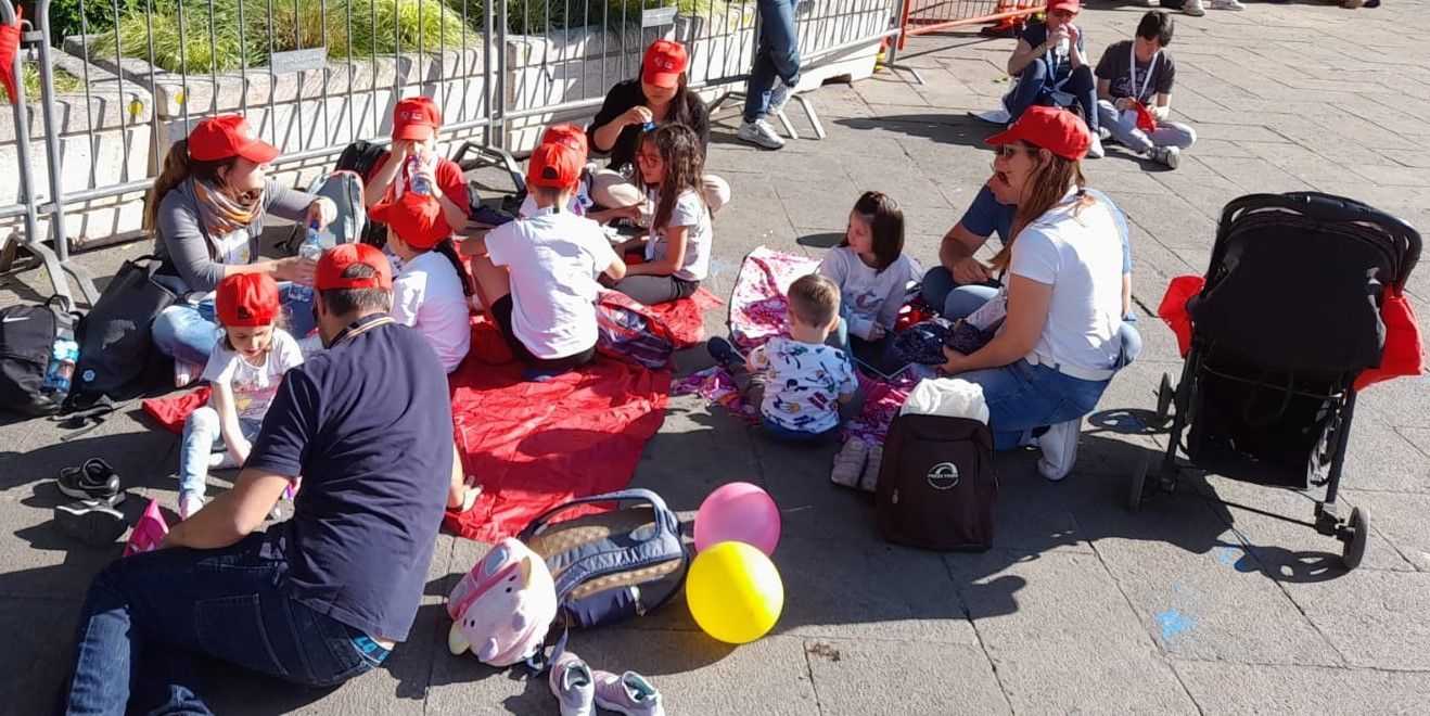 I bambini coi loro genitori tenevano stretti i pass col proprio nome e appena scesi hanno indossato con orgoglio il proprio cappellino rosso.