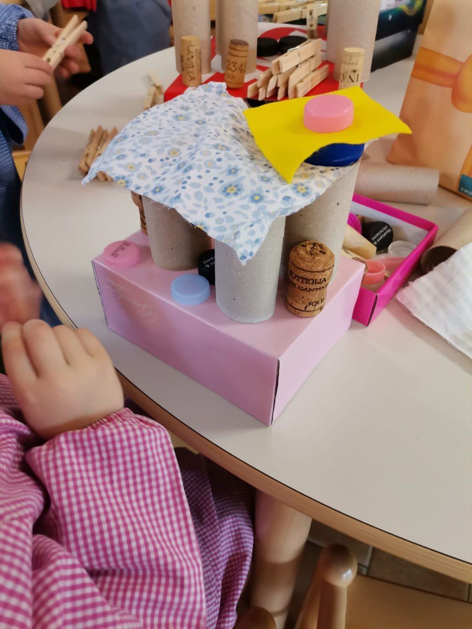 Così una pigna è diventa lo gnomo del bosco o una conchiglia la moneta per il mercato, un bastone il serpente, una molletta un coccodrillo, il rotolo della carta un trattore, tanti rotoli uno sopra l’altro un faro del mare, una molletta un Re Magio, è stata ricreata la scuola, la casa, i palazzi, il castello, un labirinto...